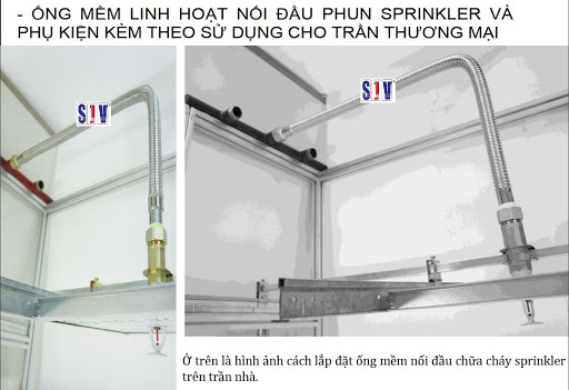 Ống nối cho đầu cứu hỏa - Flexible joint for sprinkler STS304  các nhãn hiệu SJV Flex và REALFLEX được sản xuất từ Hàn Quốc,Mỹ,TQ, trong hệ thống cứu hỏa, chữa cháy sprinkler, loại ống mềm này có độ dài khác nhau tùy khách hàng lựa chọn L= 700mm, 1000mm, 1200mm, 1500mm, 1800mm Đạt tiêu chuẩn UL, FM (ngoài ra còn có loại độ dài L= 500mm, 600mm, 2100mm, 2500mm, 2800mm, 3100mm), và có hai loại để khách hàng lựa chọn: một loại Unbraided Type ( không bọc lớp đan bằng Inox ở ngoài) Loại Braided Type ( có lớp bọc đan bằng Inox STS304 ở ngoài), Một đầu ống mềm này có nối với 1 Nipple (kép ren) làm bằng thép HR kích cỡ - Size 1”(DN25) và bước ren NPT hoặc PT được kết nối với ông cấp nước cứu hỏa chính, một đầu được nối với Reducer( côn giảm) làm bằng thép HR đầu ra có 2 kích cỡ là DN15(1/2”) và DN20(3/4”) có bước ren là NPT hoặc PT đầu này khi lắp được kết nối với đầu cứu hỏa ( Sprinkler). Square Bar (Thanh ngang-giá đỡ dài 1000mm) làm bằng thép SPCC  Ngoài ra còn có các phụ kiện cho giá đỡ kèm theo Bracket L(kẹp dài làm bằng thép SPCC), Bracket S(kẹp ngắn làm bằng thép SPHC).